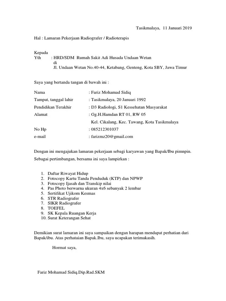 Fotocopy kartu tanda bukti pendaftaran pencari kerja yang masih berlaku dan. Scan kartu tanda penduduk (ktp); Scan surat keterangan sehat (sks); Dengan menyusun surat lamaran secara baik dan benar, maka kesempatan anda diterima pun bertambah. Scan surat keterangan catatan kepolisian (skck); Contoh surat lamaran kerja adalah sebuah contoh surat lamaran untuk mendaftar/apply sebuah pekerjaan yang kita inginkan. Pas photo format.jpeg (1 file) . Untuk kelengkapan berkas pendaftaran : Surat keterangan sehat dari dokter pemerintah (asli) yang masih berlaku. Contohnya jika anda seorang lulusan akuntansi yang ingin menjadi akuntan di rumah sakit atau di bagian keuangan di rumah sakit, jadi anda bisa . Surat lamaran kerja yang di tujukan kepada : Bidang administrasi rumah sakit terdiri dari admin bagian pendaftaran yang bertugas melayani pasien yang baru masuk. Bersama dengan surat lamaran pekerjaan ini, saya lampirkan dokumen pendukung sebagai berikut.